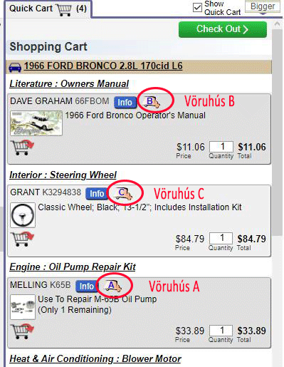 Þegar varahlutur hefur verið settur í innkaupakörfu þarf að fylgjast með litlum myndum af sendibílum.