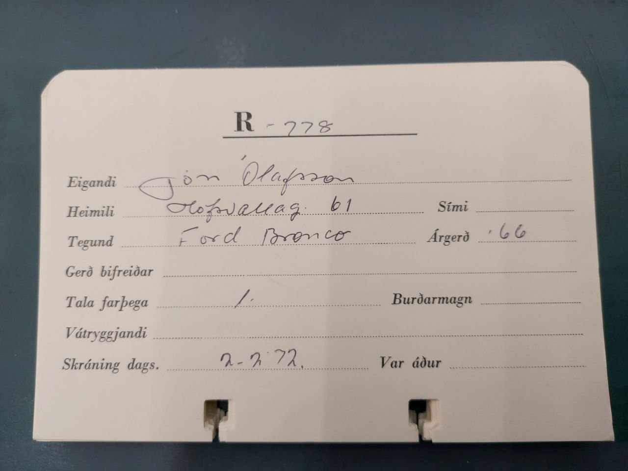 Þar duttu þeir í lukku pottinn þegar þeim voru færðar fjölmörg fyrstu kynslóðar skráningarskírteini sem höfðu að geyma nöfn eiganda og fyrri númer sem okkur voru ekki kunn.